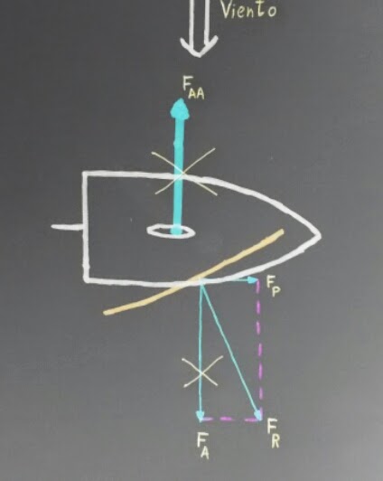 A continuación, os dejo un gráfico más sencillo, se puede ver como la Fuerza de abatimiento (Fa) se cancela con la fuerza contraria producida por la orza (Faa), y sólo nos queda la Fuerza de propulsión, que es la que nos hace avanzar.
