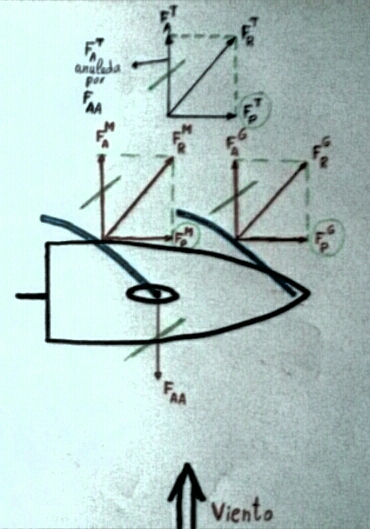 El velero suele llevar dos velas izadas, la vela de proa o delante que se llama «Génova o foque» y la vela de popa o detrás que le llamamos «Mayor». Nos centramos, primero, en el efecto del viento sobre las velas, el viento choca y circula alrededor de las velas, generando una fuerza en cada punto de las mismas, a la suma de todos esos puntos en las distintas partes de las velas nos genera una fuerza única total que le llamaremos Fuerza resultante (Fr). Al tener dos velas, cada una generaría una fuerza resultante, la suma de las dos sería la Fuerza resultante Total (FrT) que es la que nos hace navegar al barco.